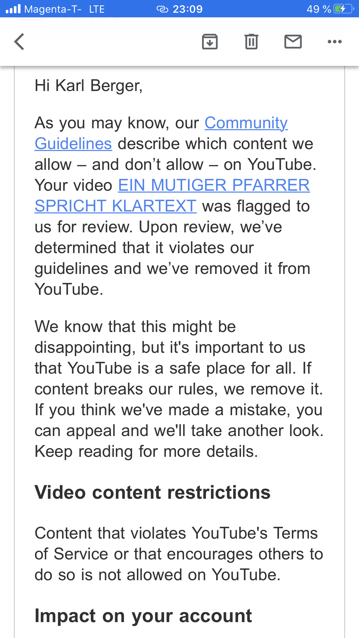 Die Predigt war sehr viel nachgefragt worden und hatte am Sonntagmorgen zum Zeitpunkt ihrer Löschung bereits rund 82 000 Aufrufe auf unserem YouTube-Kanal. Nach einer Beschwerde bei YouTube am Montagmittag wurde es für rund ein bis zwei Stunden wieder freigeschaltet, um dann erneut gelöscht zu werden.
